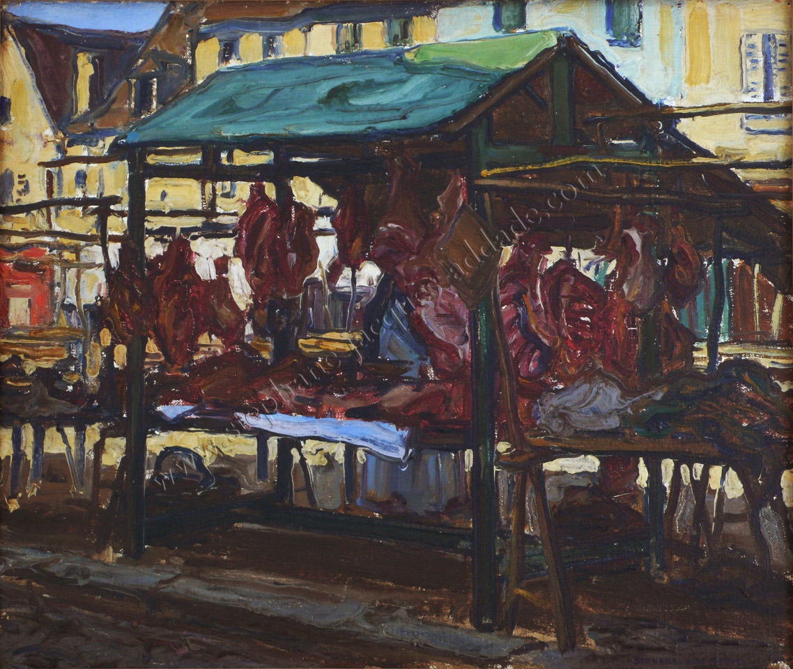 Parallèlement à cette activité d'aquafortiste, Bernard Boutet de Monvel travaille la peinture à l'huile, et notamment le portrait qu'il commence à exposer à la Société nationale des Beaux-Arts dès 1903. Très vite, il envoie également des oeuvres au Salon d'Automne et au Salon des Indépendants. A partir de 1907, alors que son talent est reconnu aussi bien en Europe qu'aux Etats-Unis, il envoie régulièrement des oeuvres aux expositions du Carnegie Institute de Pittsburgh (Pennsylvanie). Sa matière, dans un premier temps tortueuse et brutale, traitée en pleines pâtes vivement colorées et cernées d'ombres bleu marine (Les boucheries 1904) devient brusquement pointilliste en 1904, après un voyage d'étude à Florence. La lumière se fait alors légère et vibrante, le motif se cerne d'un fin halo jaune pâle, la perspective disparaît et déjà, la droite, tracée à la règle, commence, çà et là, à faire son apparition (Rita del Erido SNBA 1907, Le sophora c. 1907...).